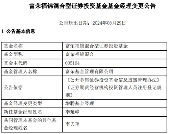 中国经济网北京8月29日讯 今日,富荣基金管理有限公司公告称,富荣福锦混合(A类005164;C类005165)增聘基金经理李延峥。