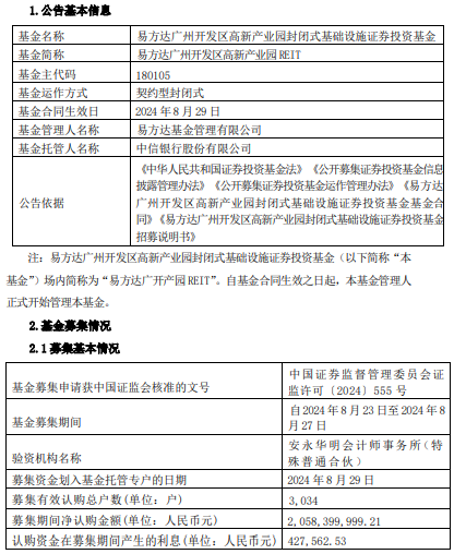 易方达广州开发区高新产业园REIT成立 规模20.58亿元