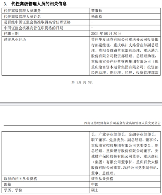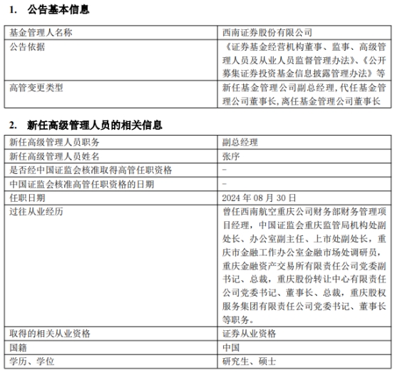 中国经济网北京9月2日讯 近日,西南证券股份有限公司发布基金行业高级管理人员变更公告。公告称,公司董事长吴坚到龄退休,杨雨松代任董事长,张序任副总经理。