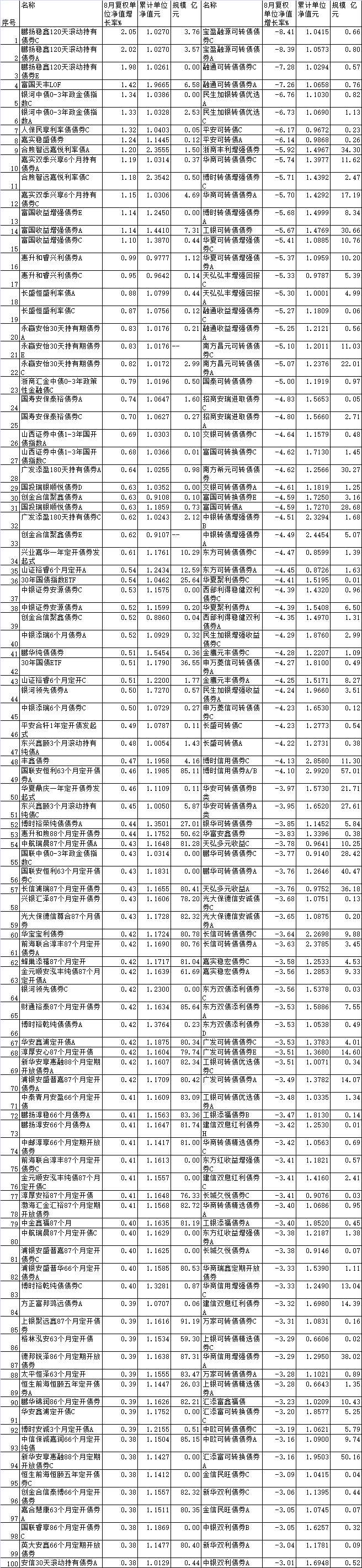 2024年8月债券型基金涨跌幅前100名