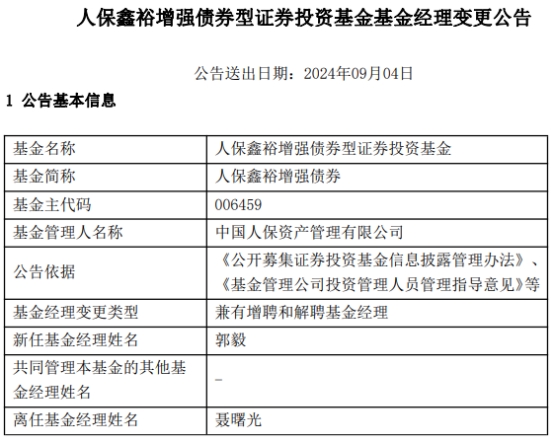 人保鑫裕增强债券增聘基金经理郭毅。郭毅历任中银证券资产管理部投资经理、上投摩根基金债券基金经理、兴业证券行业分析师、上海钢联行业分析师、德勤会计师事务所审计师,2023年7月加入人保资产。2024年5月30日起任人保利丰纯债债券型证券投资基金基金经理、2024年7月3日起任人保鑫泽纯债债券型证券投资基金基金经理。