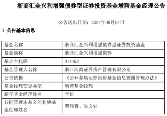 中国经济网北京9月4日讯 今日,浙江浙商证券资产管理有限公司公告称,浙商汇金兴利增强债券(A类014492;C类014493)增聘基金经理李松。