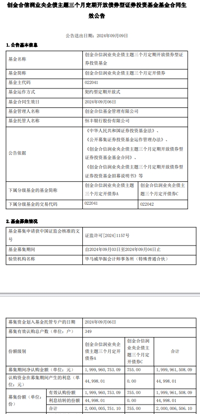 创金合信润业央企债主题三个月定开成立 募集金额20亿
