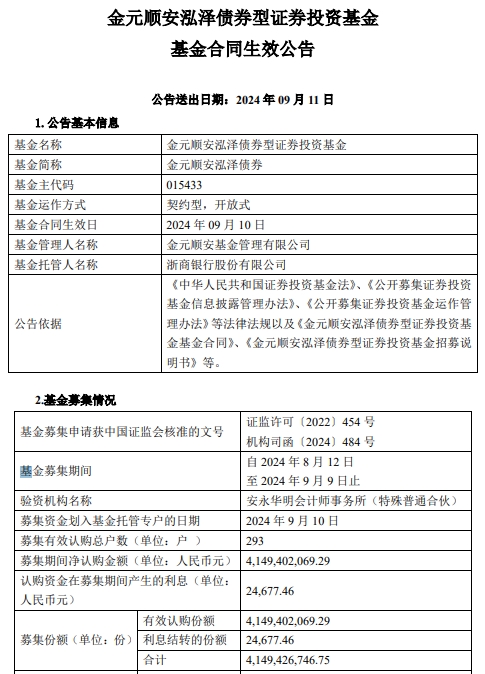 金元顺安泓泽债券成立 募集金额41.5亿元