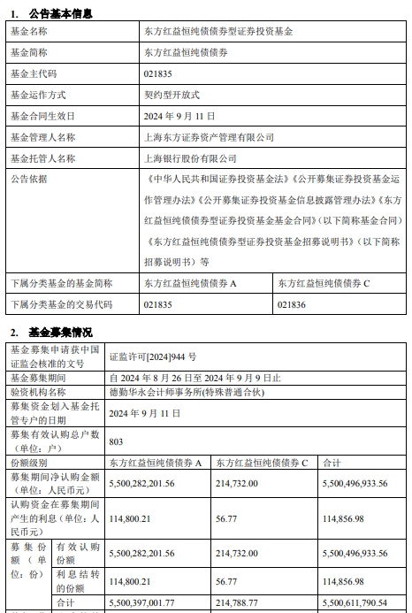 该基金募集期间净认购金额合计5,500,496,933.56元,认购资金在募集期间产生的利息合计114,856.98元,募集份额合计5,500,611,790.54份。