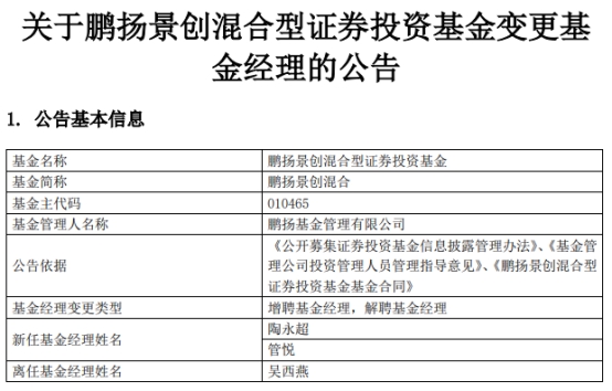 鹏扬景创混合增聘基金经理陶永超与管悦 吴西燕离任