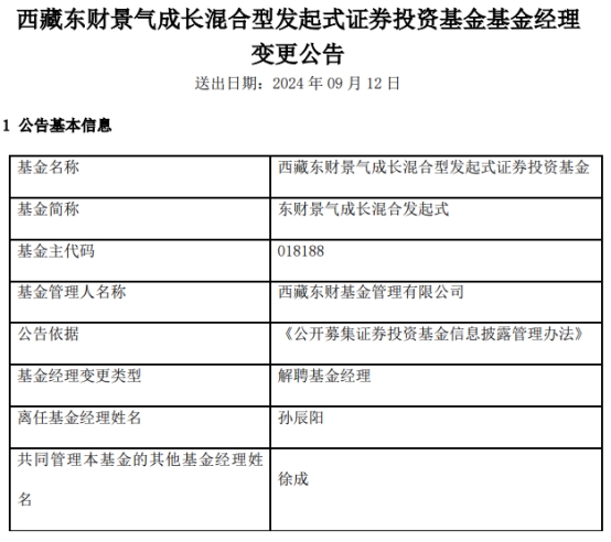 中国经济网北京9月12日讯 今日,西藏东财基金管理有限公司公告称,孙辰阳离任东财景气成长混合发起式。