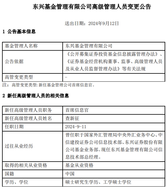 中国经济网北京9月12日讯 今日,东兴基金管理有限公司发布高级管理人员变更公告。公告称,查新征任公司首席信息官。
