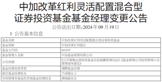 中国经济网北京9月19日讯 今日,中加基金管理有限公司公告称,中加改革红利混合(001537)增聘基金经理于成琨。