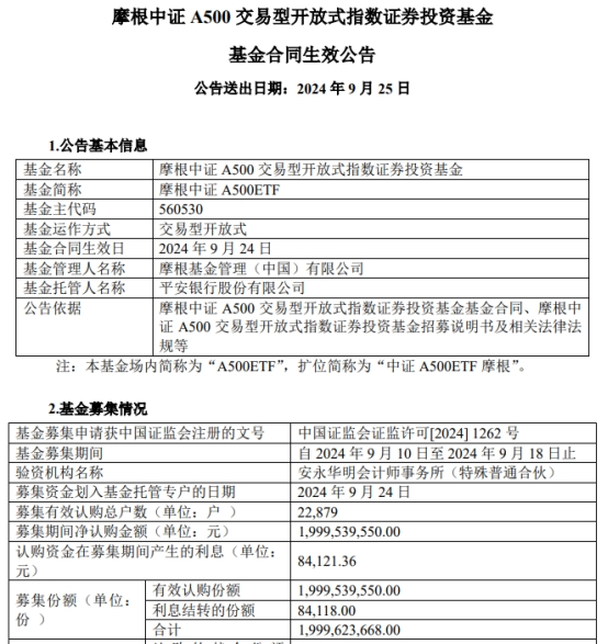 摩根中证A500ETF成立 募集金额20亿元