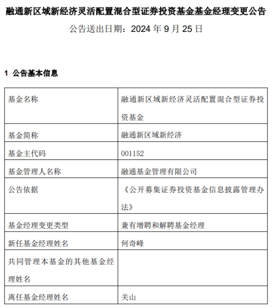 中国经济网北京9月25日讯 今日,融通基金管理有限公司公告称,融通新区域新经济(前端:001152,后端:001153)增聘基金经理何奇峰,关山离任。