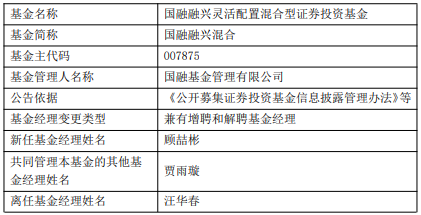 中国经济网北京9月25日讯 今日,国融基金管理有限公司公告,国融融兴混合增聘基金经理顾喆彬,汪华春离任。