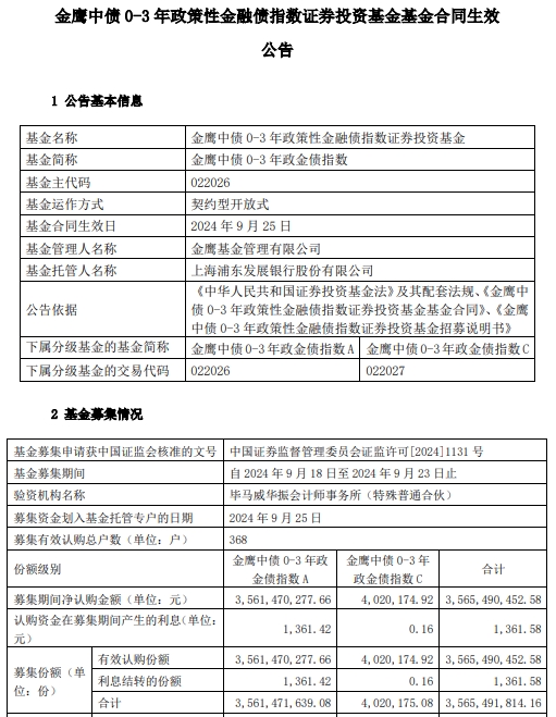 金鹰中债0-3年政金债成立 募集金额35.65亿元