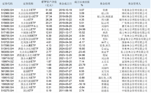 Wind数据显示,目前已经上市发行的国企/央企ETF共有26只,其中规模在10亿元以上的有8只。截至9月24日,央企改革ETF(512950.SH)规模为51.82亿元,央企结构调整ETF(512960.SH)规模为46.98亿元。