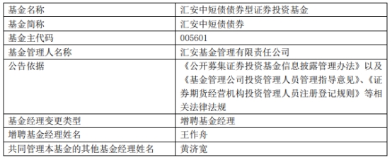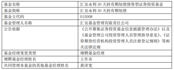 中国经济网北京10月9日讯 今日,汇安基金管理有限责任公司公告称,汇安永利30天持有期短债(A类015008;C类015009)、汇安中短债债券(A类005601;C类005602;D类020173;E类007211;F类021806)增聘基金经理王作舟。