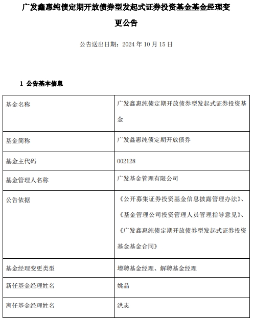 广发鑫惠纯债定期开放债券增聘基金经理姚晶 洪志离任