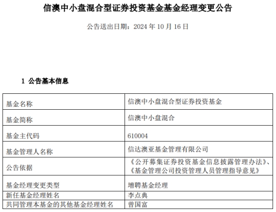 中国经济网北京10月16日讯 今日,信达澳亚基金管理有限公司公告称,信澳中小盘混合(610004)增聘基金经理李点典。