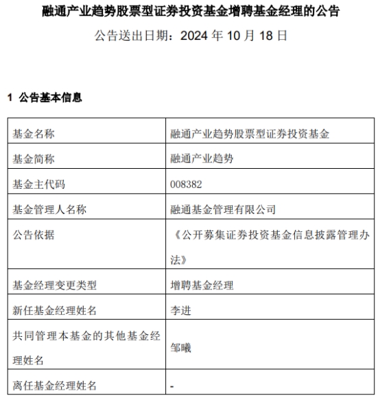 中国经济网北京10月18日讯 今日,融通基金管理有限公司公告称,融通产业趋势(008382)增聘基金经理李进。