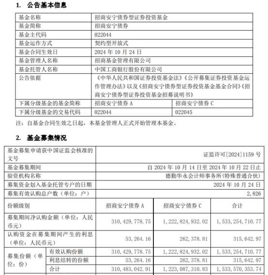该基金募集期间净认购金额合计1,533,254,710.77元,认购资金在募集期间产生的利息315,642.97元,募集份额合计1,533,570,353.74份。