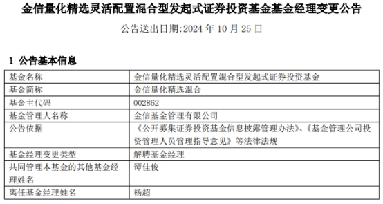 中国经济网北京10月25日讯 今日,金信基金管理有限公司公告称,杨超离任金信量化精选混合(A类002862;C类020434)。