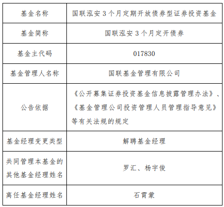 石霄蒙离任国联泓安3个月定开债券