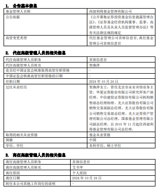 西部利得基金总经理贺燕萍代任首席信息官 艾书苹离任