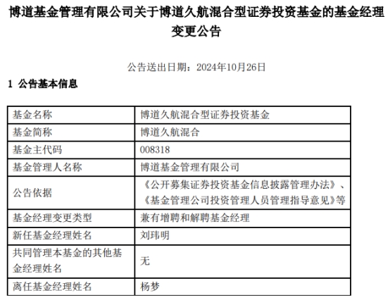 中国经济网北京10月28日讯 近日,博道基金管理有限公司公告称,博道久航混合(A类008318;C类008319)增聘基金经理刘玮明,杨梦离任。