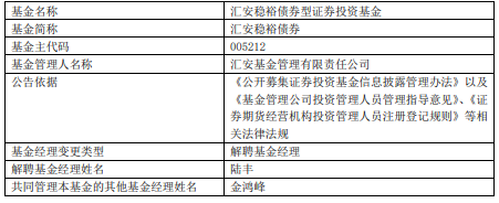 陆丰离任汇安稳裕债券 金鸿峰管理