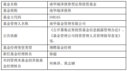 中国经济网北京10月31日讯 今日,南华基金管理有限公司公告,南华瑞泽债券增聘基金经理徐超。