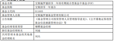 中国经济网北京10月31日讯 今日,交银施罗德基金管理有限公司公告,交银招享一年混合增聘基金经理刘迪。