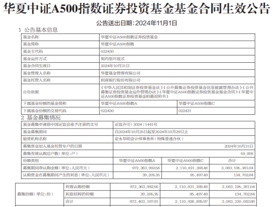 华夏中证A500指数成立 募集金额30.8亿元