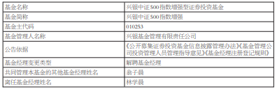林学晨离任兴银中证500指数增强 成立3年半亏10%