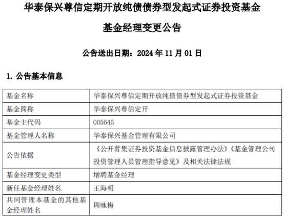 中国经济网北京11月1日讯 今日,华泰保兴基金管理有限公司公告称,华泰保兴尊信定开(005645)增聘基金经理王海明。