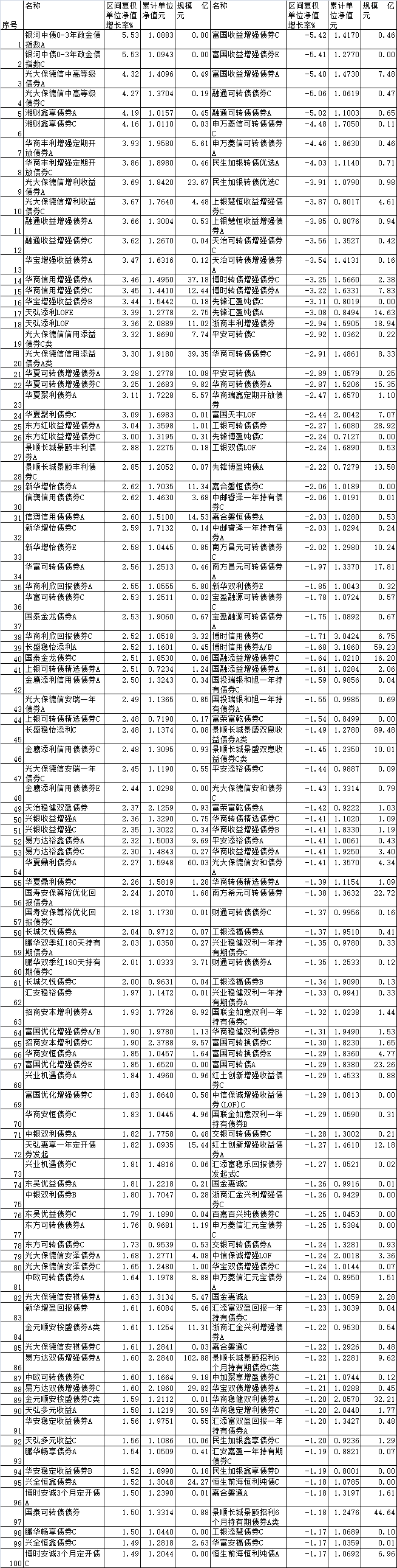 其他涨幅超过3%的债基还包括华宝增强收益债券、天弘添利LOF、光大保德信信用添益债券、华夏可转债增强债券、华夏聚利债券等。