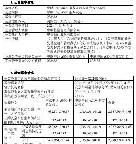 中欧中证A500指数发起成立 规模23.88亿元