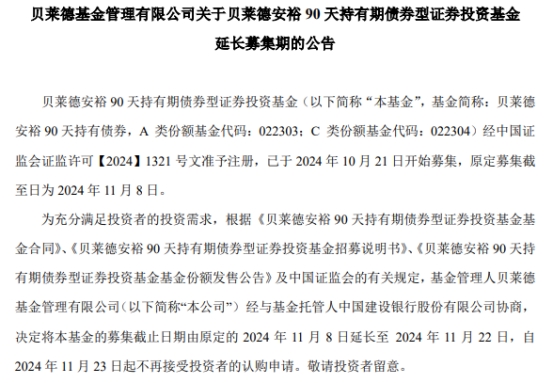 中国经济网北京11月6日讯 今日,贝莱德基金管理有限公司发布关于贝莱德安裕90天持有期债券型证券投资基金延长募集期的公告。公告称,贝莱德安裕90天持有期债券(A类份额基金代码:022303;C类份额基金代码:022304)于2024年10月21日开始募集,原定募集截至日为2024年11月8日,现决定将该基金的募集截止日期延长至2024年11月22日。