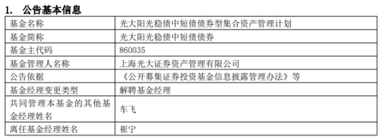 中国经济网北京11月8日讯 今日,上海光大证券资产管理有限公司公告称,崔宁离任光大阳光稳债收益12个月持有债券(A类860012;C类860033)、光大阳光稳债中短债债券(A类860035;C类860050)。