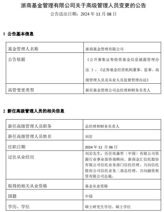 中国经济网北京11月8日讯 今日,浙商基金管理有限公司发布高级管理人员变更公告。公告称,刘岩任公司总经理和财务负责人。