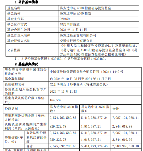 易方达中证A500指数基金成立 规模79.9亿元