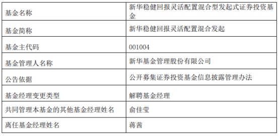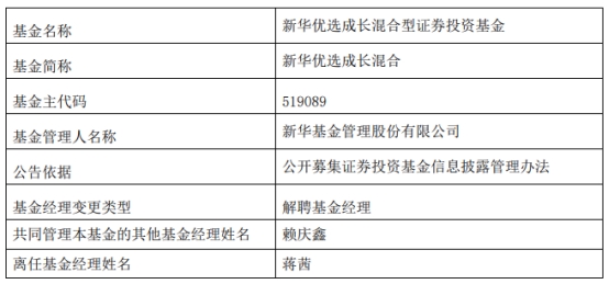中国经济网北京11月13日讯 今日,新华基金管理股份有限公司公告称,蒋茜离任新华鑫益灵活配置混合(A类014150;C类000584)、新华稳健回报灵活配置混合发起(001004)、新华优选成长混合(519089)。