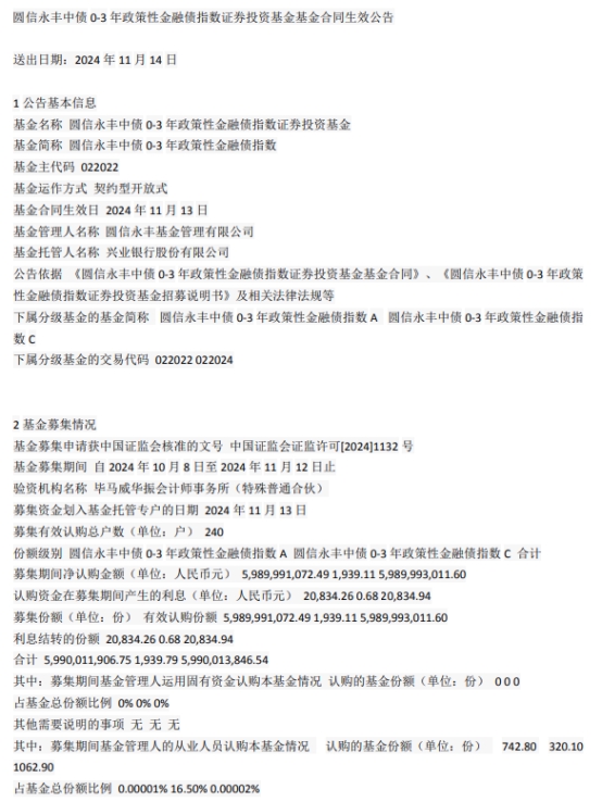 中国经济网北京11月14日讯 今日,圆信永丰基金管理有限公司发布圆信永丰中债0-3年政策性金融债指数证券投资基金基金合同生效公告。