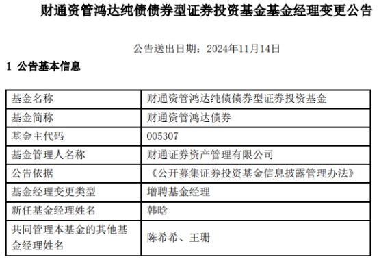 中国经济网北京11月14日讯 今日,财通证券资产管理有限公司公告称,财通资管鸿达债券(A类005307;C类005308;E类005882;I类011067)增聘基金经理韩晗。