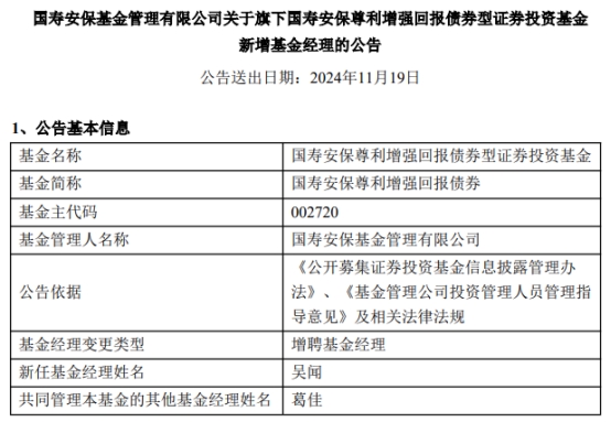 中国经济网北京11月19日讯 今日,国寿安保基金管理有限公司公告称,国寿安保尊利增强回报债券(A类002720;C类002721)增聘基金经理吴闻。