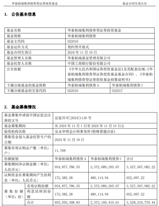 中国经济网北京11月20日讯 今日,华泰柏瑞基金管理有限公司发布华泰柏瑞集利债券型证券投资基金基金合同生效公告。