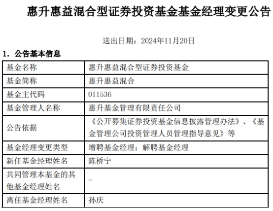 惠升惠益混合增聘基金经理陈桥宁 孙庆离任