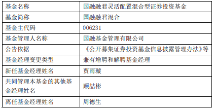 国融融君混合增聘基金经理贾雨璇 周德生离任