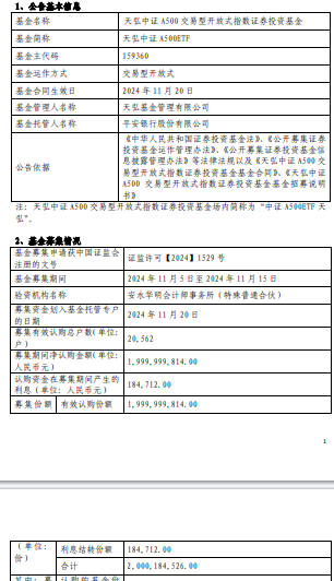 天弘中证A500ETF成立 规模20亿