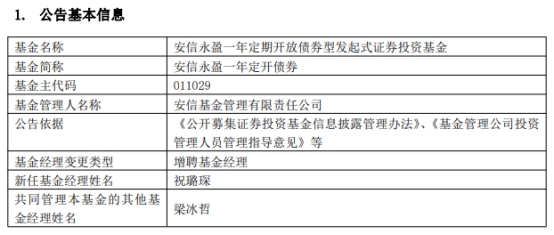 安信永盈一年定开债券增聘基金经理祝璐琛