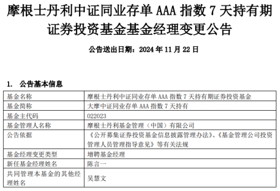 大摩中证同业存单AAA指数7天持有增聘陈言一