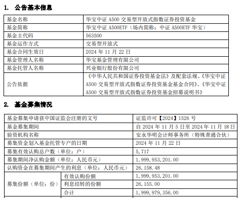 中国经济网北京11月25日讯 近日,华宝基金管理有限公司发布华宝中证A500交易型开放式指数证券投资基金基金合同生效公告。